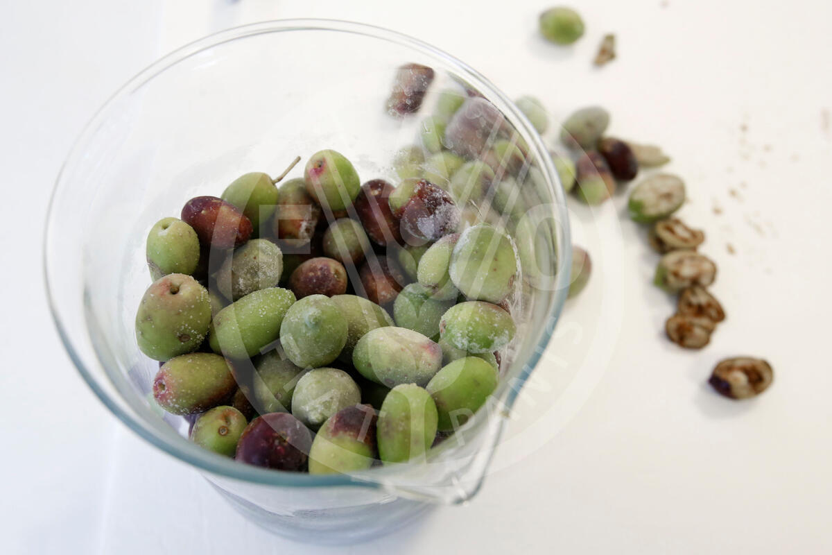 10 March 2015, Benevento, Italy - A laboratory technician performing a quality control test on a sample of frozen olives affected by olive pest in the food and quality research laboratory of an olive oil factory. This year Italy's olive crop was particularly hard-hit by extensive attacks by olive fruit flies, Bactrocera oleae, and leaf scorch, caused by the bacterium Xylella fastidiosa, which has infected thousands of hectares of olive groves in the southern Italian province of Apulia.
