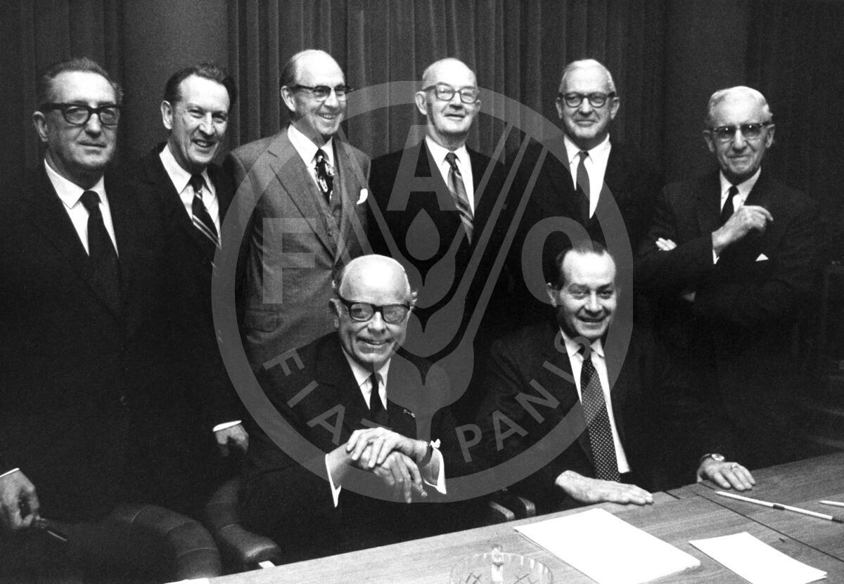 16 October 1970, Ottawa - Dr. A. H. Boerma, Director-General of the Food and Agriculture Organization of the United Nations (FAO) from 1967-1975, sitting, first left, and Hon. H.A. Olson, Minister of Agriculture. Ottawa commemorative ceremony, FAO 25th anniversary.