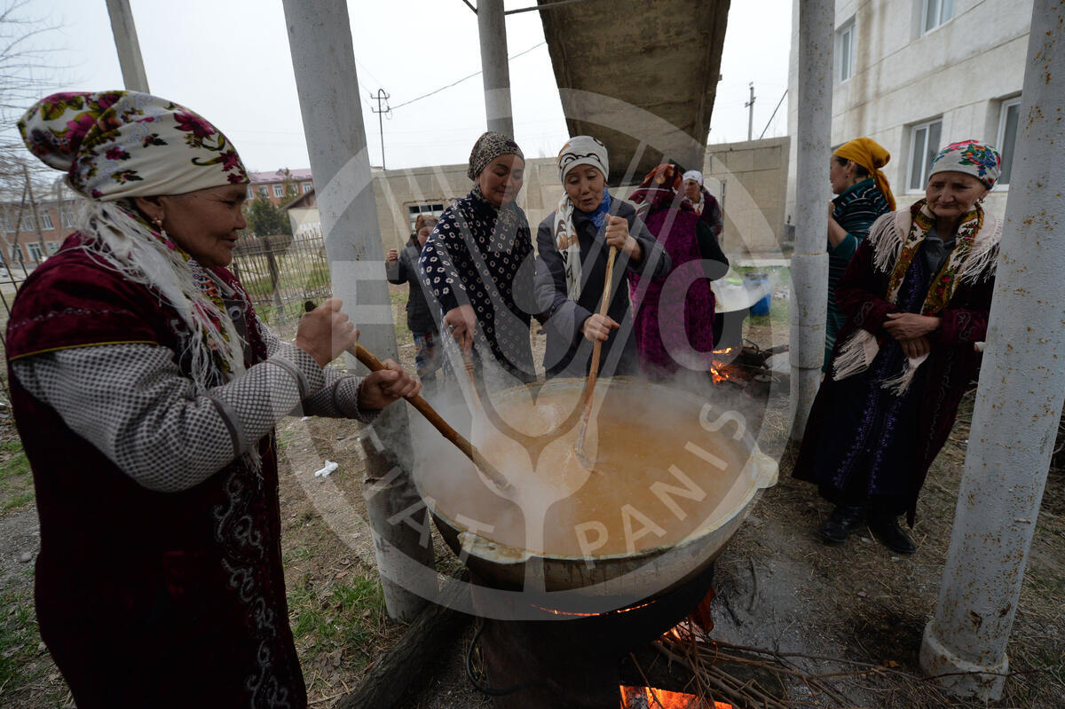 20 March 2017, Kulundu, Kyrgyzstan - Kyrgyz women wearing national costumes cook national food of sprouted wheat 'Sumelek' during preparations for the celebration of Nowruz (New Year) in the village of Kulundu, 1150 km from Bishkek, Kyrgyzstan on 20 March 2017. Nowruz, "The New Year" in Farsi, is an ancient festival marking the first day of spring in Central Asia.