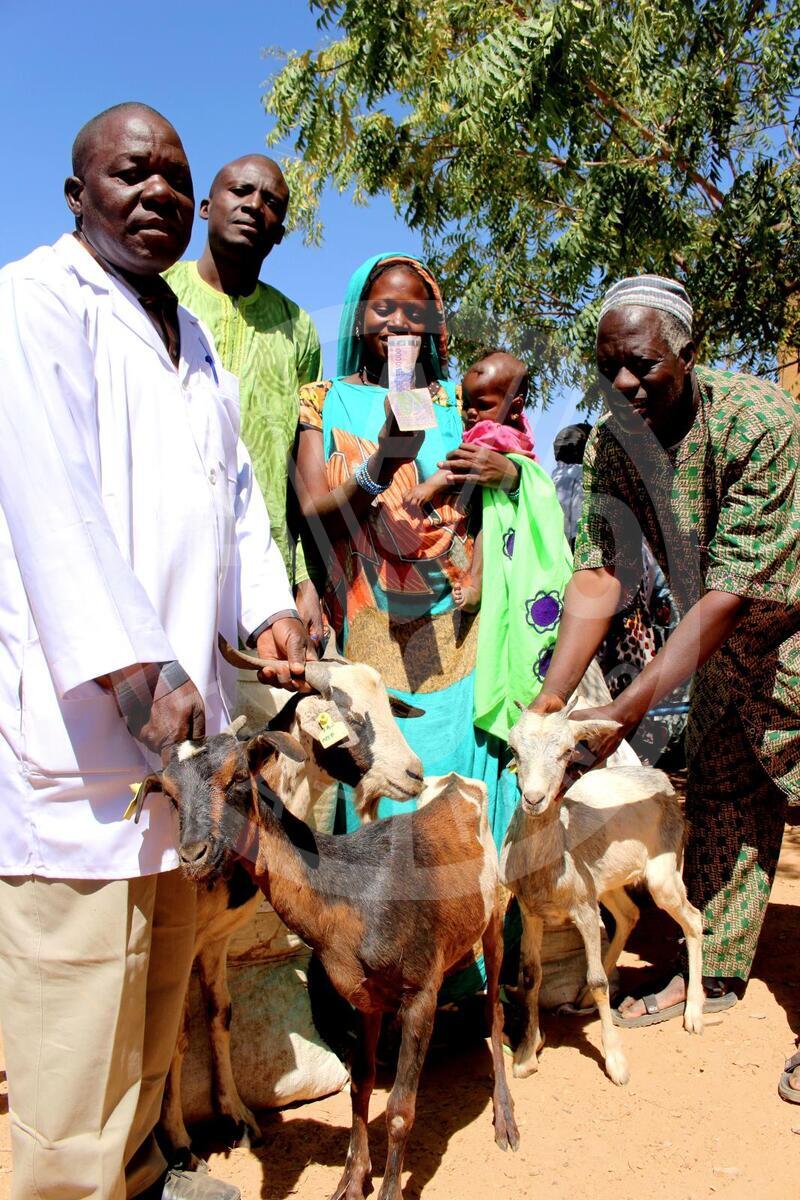 18 March 2016, Guatema, Mali - Oumou, a woman enrolled in the productive transfers (CASH+) programme, standing with FAO implementing partners during the distributions, Nioro Tougouné Rangabé village, Nioro du Sahel Circle, Kayes Region, Mali. Under the productive transfers/CASH+ programme, women are the direct recipients of cash transfers in 99 percent of the cases in this country. In order to increase the resilience of vulnerable households affected by repeated shocks in the Sahel, FAO is currently experimenting the Ӱroductive transfers" approach (CASH+) in Mali and Mauritania. The 18-month programme, based on a successful FAO project implemented in 2014 in Burkina Faso and Niger, combines unconditional cash transfers with the provision of in-kind livestock inputs to benefit 1250 very poor vulnerable households in 46 villages of the Kayes region and the Wilaya of Gorgol. In order to better cope with, recover from and adapt to the multiple shocks and recurrent crises affecting the Sahel region, the poorest households need to protect their livelihoods, diversify their sources of income and accumulate productive assets.