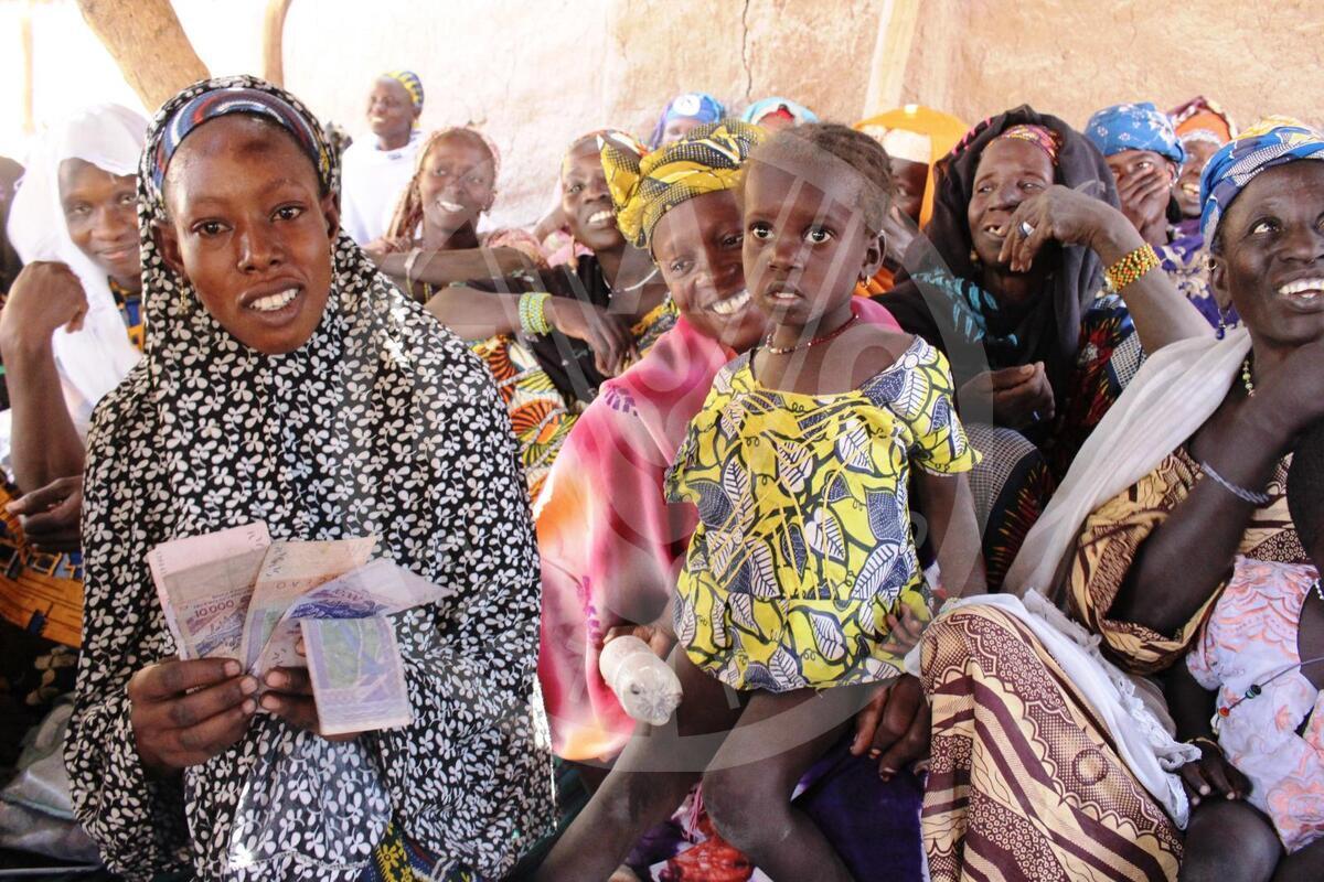 18 March 2016, Guetema , Mali - Women receiving the first tranche of the cash transfer, Diabidiala village, Simby, Nioro du Sahel Circle, Kayes Region, Mali. Under the productive transfers/CASH+ programme, women are the direct recipients of cash transfers in 99 percent of the cases in this country. In order to increase the resilience of vulnerable households affected by repeated shocks in the Sahel, FAO is currently experimenting the Ӱroductive transfers" approach (CASH+) in Mali and Mauritania. The 18-month programme, based on a successful FAO project implemented in 2014 in Burkina Faso and Niger, combines unconditional cash transfers with the provision of in-kind livestock inputs to benefit 1250 very poor vulnerable households in 46 villages of the Kayes region and the Wilaya of Gorgol. In order to better cope with, recover from and adapt to the multiple shocks and recurrent crises affecting the Sahel region, the poorest households need to protect their livelihoods, diversify their sources of income and accumulate productive assets.