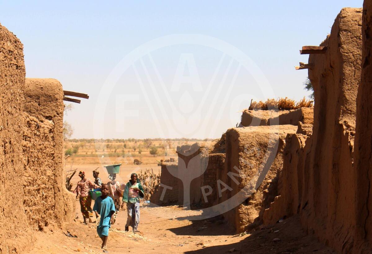 18 March 2016, Guetema, Mali - Women returning to the village after collecting water from a community water point in Diabidiala village, Nioro du Sahel Circle, Kayes Region, Mali. FAO implements productive transfers in remote areas of Mali and Mauritania to strengthen the resilience of vulnerable communities suffering from food insecurity. Under the productive transfers/CASH+ programme, women are the direct recipients of cash transfers in 99 percent of the cases in this country. In order to increase the resilience of vulnerable households affected by repeated shocks in the Sahel, FAO is currently experimenting the Ӱroductive transfers" approach (CASH+) in Mali and Mauritania. The 18-month programme, based on a successful FAO project implemented in 2014 in Burkina Faso and Niger, combines unconditional cash transfers with the provision of in-kind livestock inputs to benefit 1250 very poor vulnerable households in 46 villages of the Kayes region and the Wilaya of Gorgol. In order to better cope with, recover from and adapt to the multiple shocks and recurrent crises affecting the Sahel region, the poorest households need to protect their livelihoods, diversify their sources of income and accumulate productive assets.
