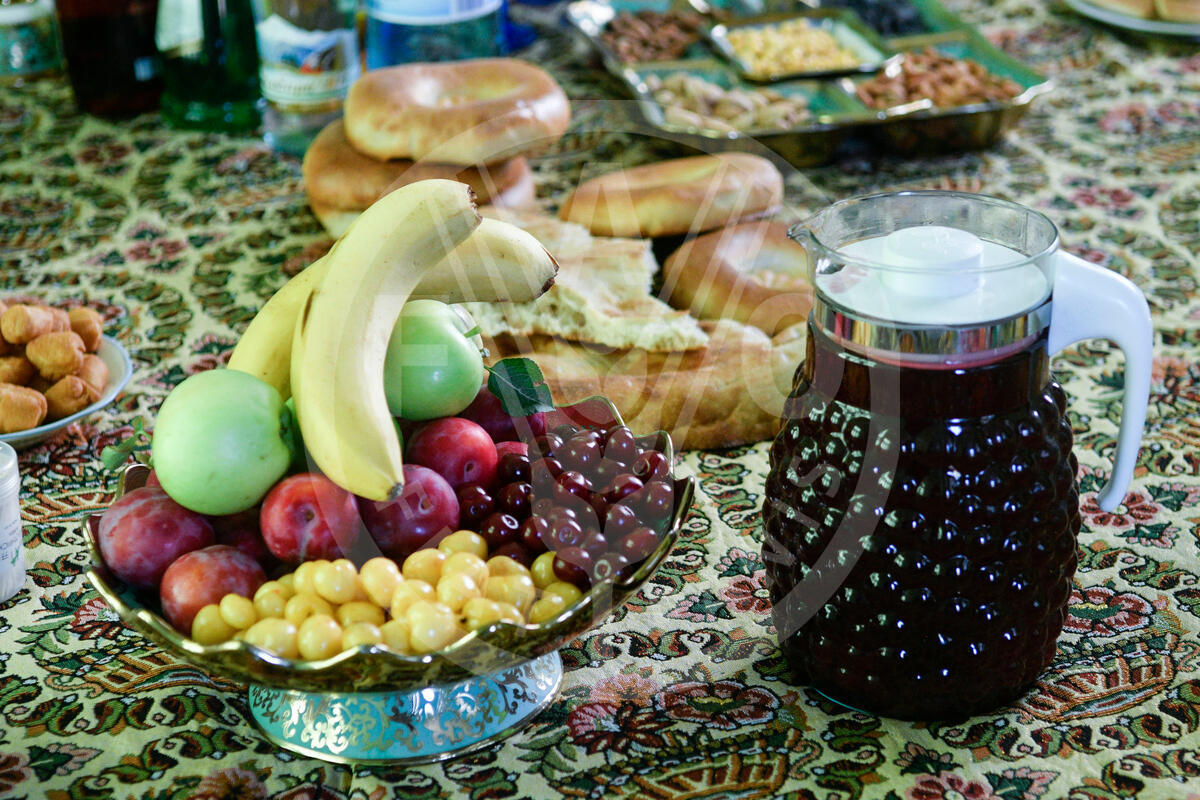 29 May 2019, Dusti, Tajikistan - Fruit, fruit compote, bread and other snacks served at a rural family's home in Tajikistan.