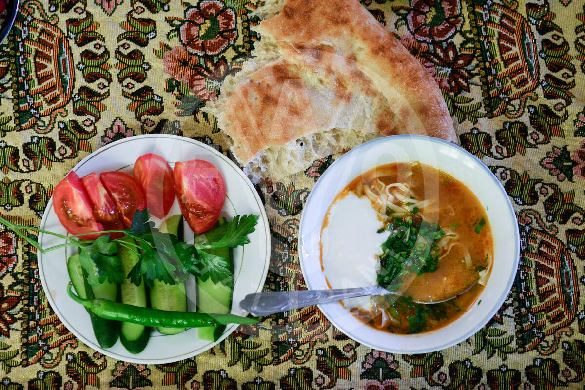 29 May 2019, Dusti, Tajikistan - A traditional noodle soup, called laghmon, is being served at a rural family's home with fresh salad and bread. Beside the home-made noodle, it contains chickpeas and vegetables, and was prepared on open fire.