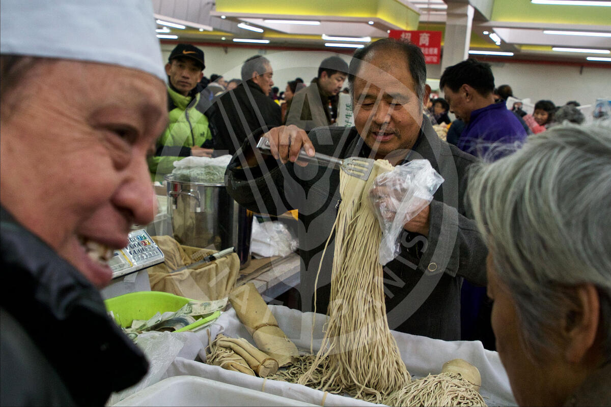 05 March 2016, Beijing, China - A man at a market in Beijing?s Lucky Street sells bean curd shreds.