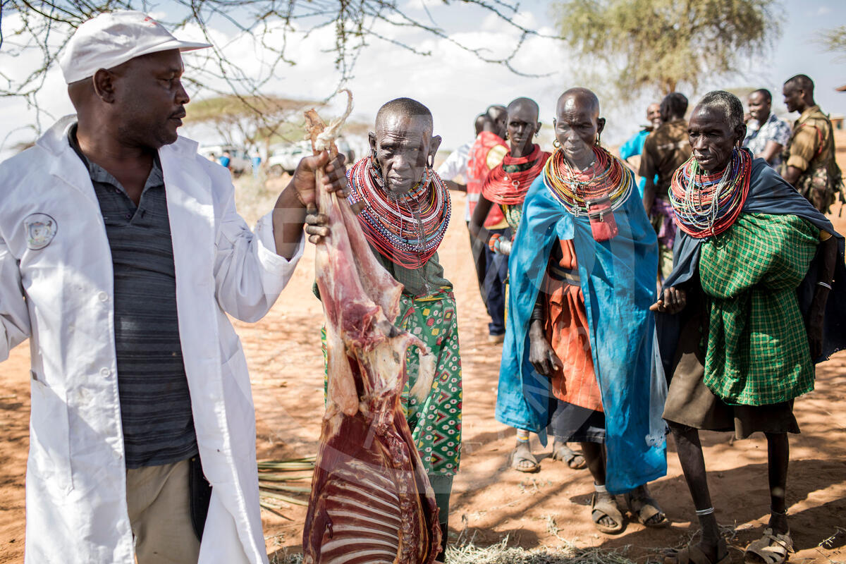 27 September 2017, Barsaloi, Kenya - A Public Health Officer of Samburu County give some goat meat to some members of Samburu pastoral community during the destocking programme that FAO and Red Cross Kenya are developing in Samburu County as part of the Central Emergency Response to Drought in a remote area near Barsolai, Samburu County.