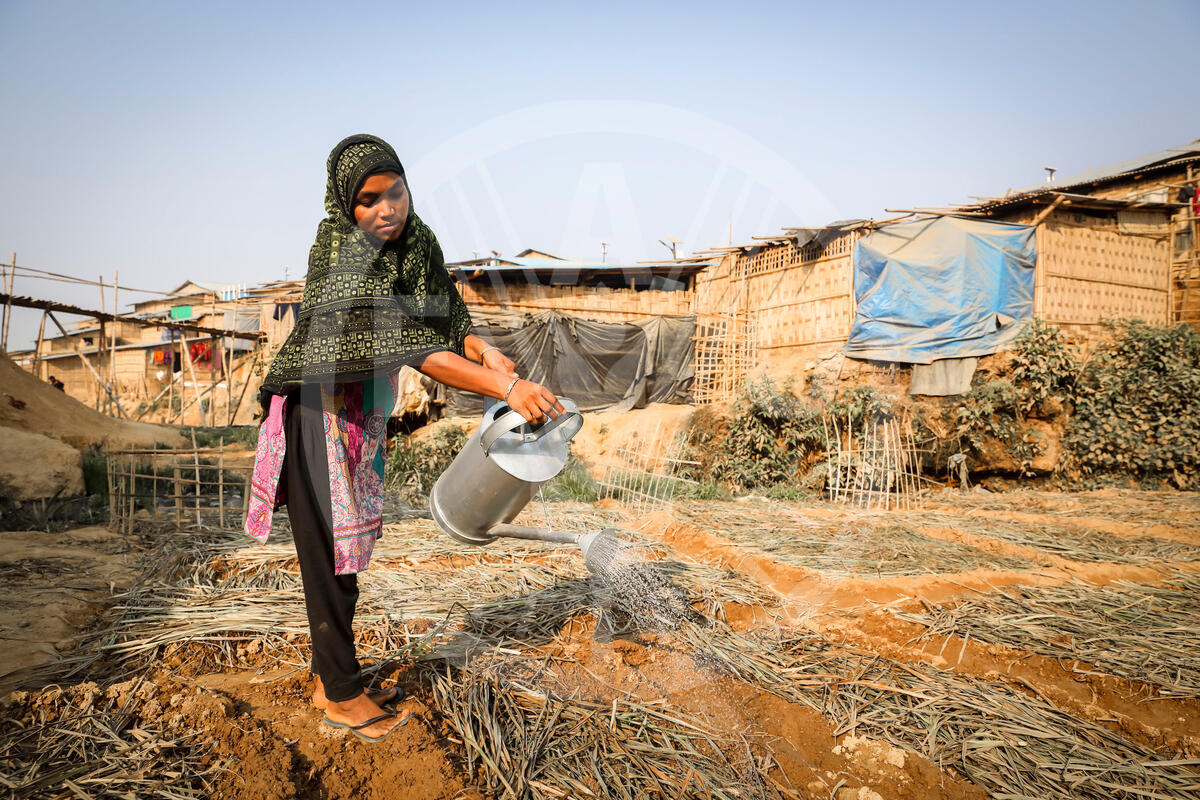 23 March 2018, Kutupalong Camp, Cox's Bazar, Bangladesh - Hamida using in her vegetable garden a watering can, part of of the micro-gardening kits being distributed through the project.