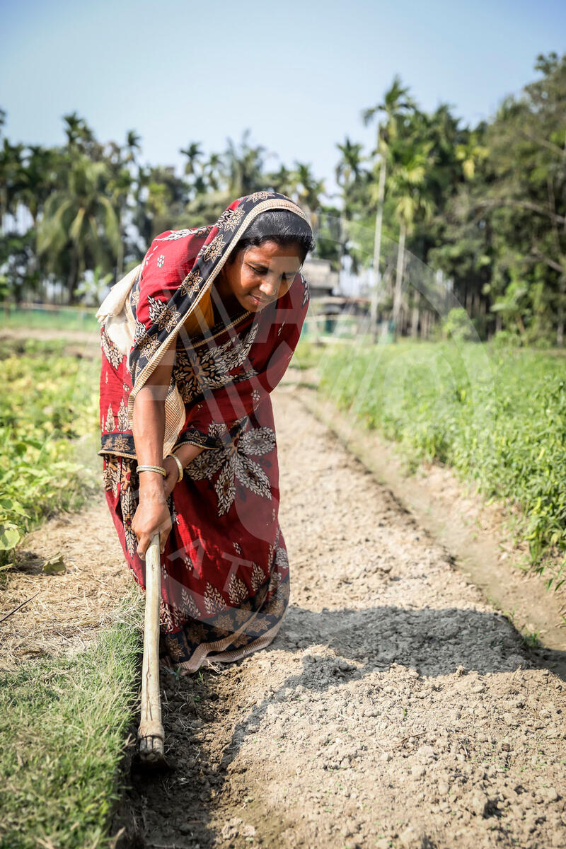 22 March 2018, Valukia Majerpara, FFS, Ukhiya, Cox's Bazar, Bangladesh - Ferdousy Begum,35, member of FFS, using in her vegetable garden a hoe, part of of the micro-gardening kits being distributed through the project.
