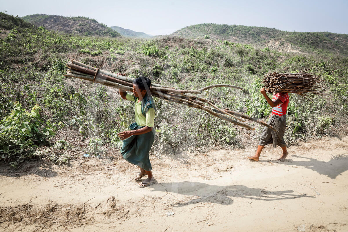 21 March 2018, Ukhiya, Cox's Bazar, Bangladesh - Rohingya refugees cutting down trees for firewood and to construct makeshift shelters.