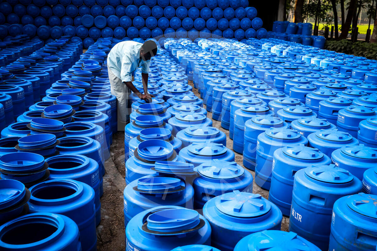20 March 2018, Cox's Bazar. Bangladesh - Food storage drums standing in a warehouse, as part of the kits being distributed through FAO Project OSRO/BGD/704/IOM. Emergency Nutrition and Food Security Intervention for People Affected by the Refugee Crisis in Cox's Bazar.