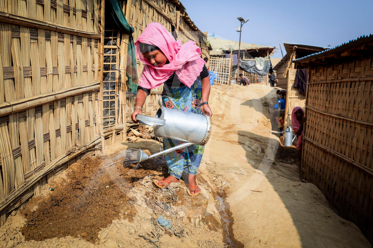 23 March 2018, Kutupalong Camp, Cox's Bazar, Bangladesh - Nur Begum, 25, using in her vegetable garden a watering can, part of of the micro-gardening kits being distributed through the project.