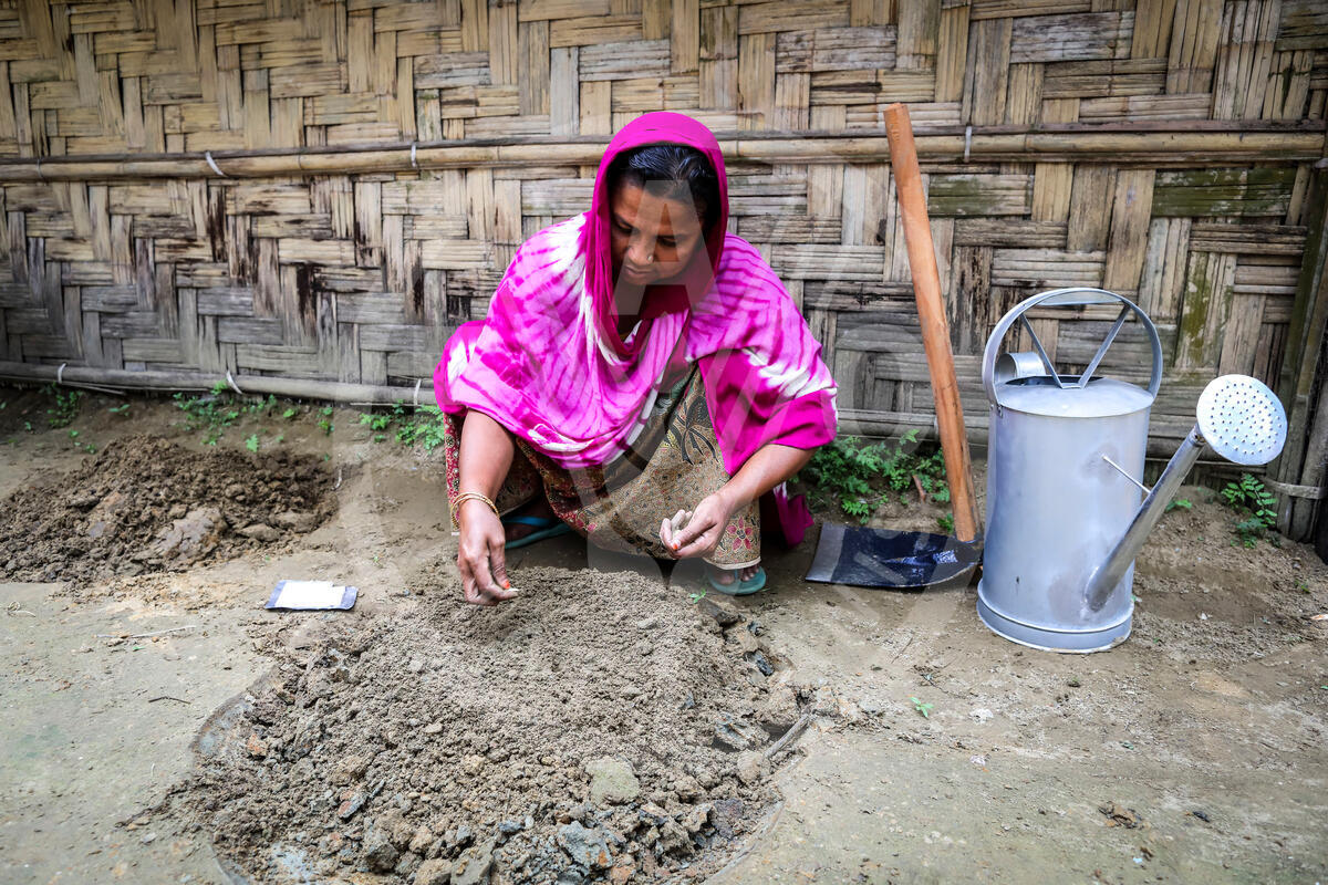 24 March 2018, Noiton Para, Teknaf, Bangladesh - Momtaj Begum, 45, planting seeds, part of the micro-gardening kits being distributed through the project.