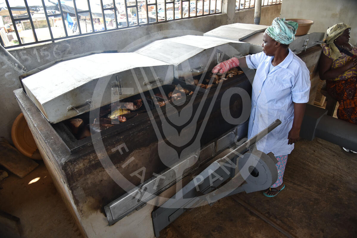 CÔTE D'IVOIRE 2015. Woman at fish smoking oven at the coastal area of Port-Bouet