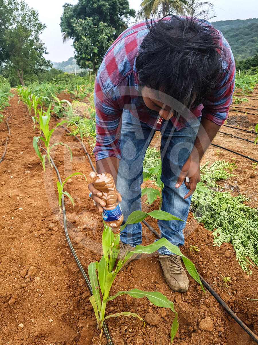28 November 2018, Andhra Pradesh, India - Mohamed Sohail Farmer Field Schools (FFS) facilitator trained by FAO demonstrate low cost management method in India.