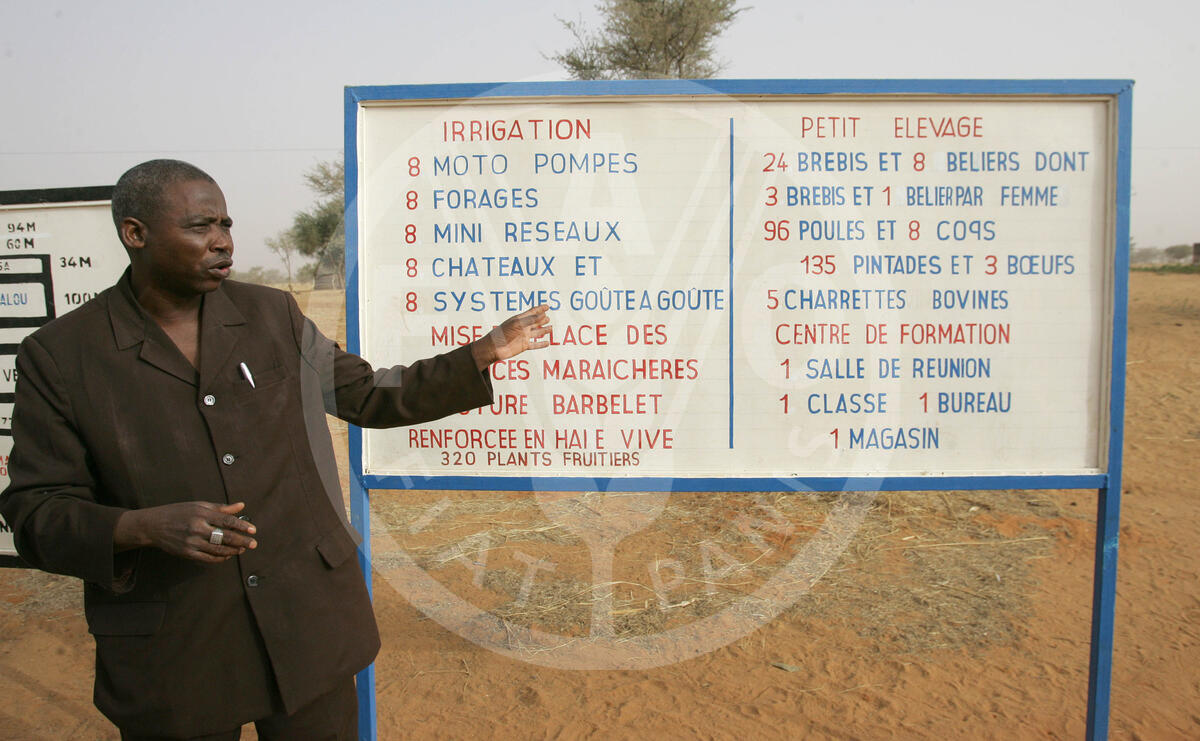 NIGER 2007. A local farmer standing in front of a sign distinguishing the FAO project gardens.