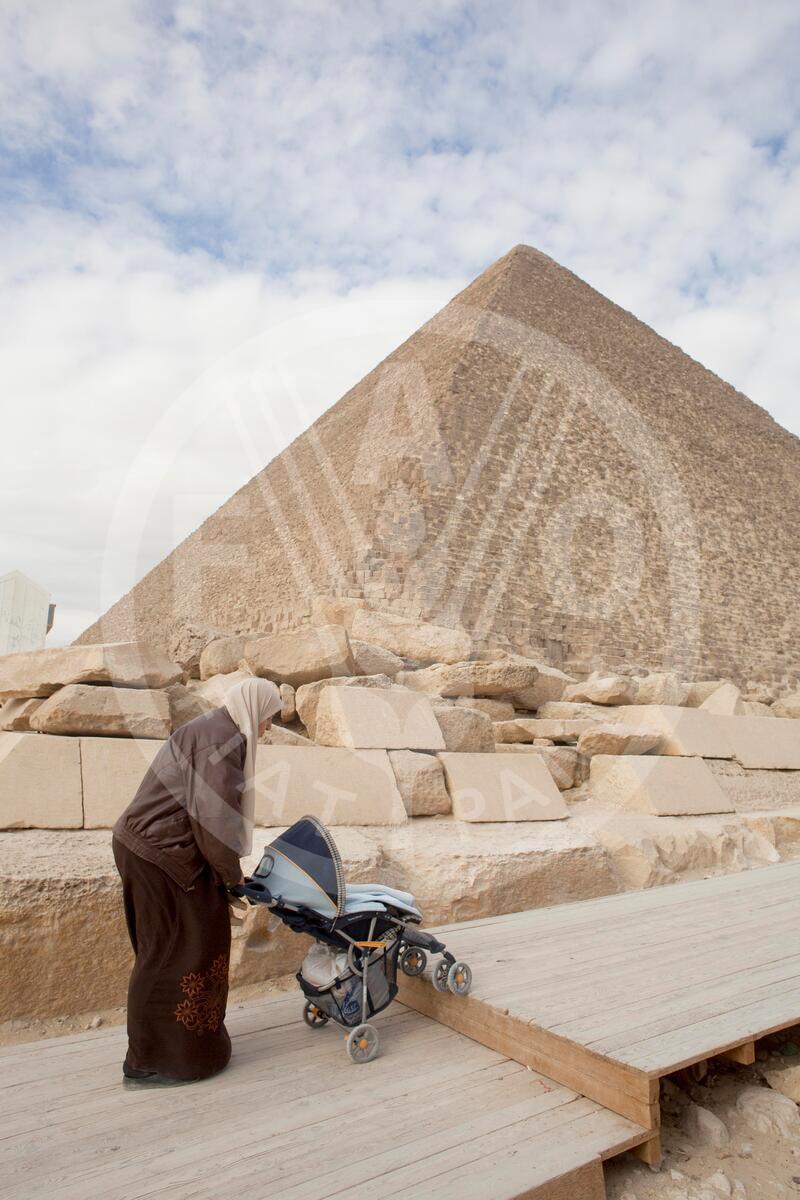 11 December 2009, Cairo - A woman with a stroller visiting the Great Pyramids of Giza located on the outskirts of Cairo.