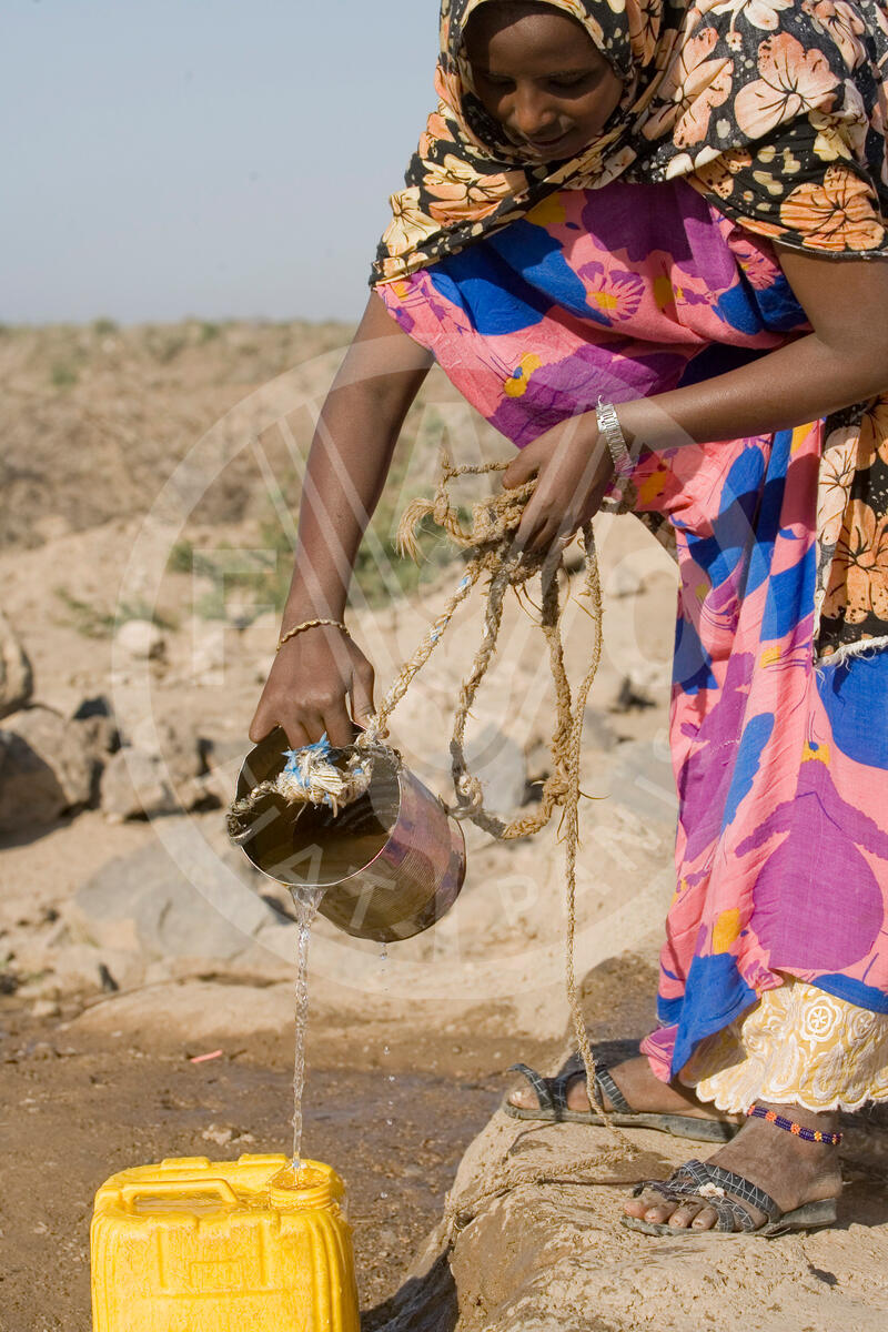 ETHIOPIA 2009. A man refreshes himself with water collected from a dry river bed.