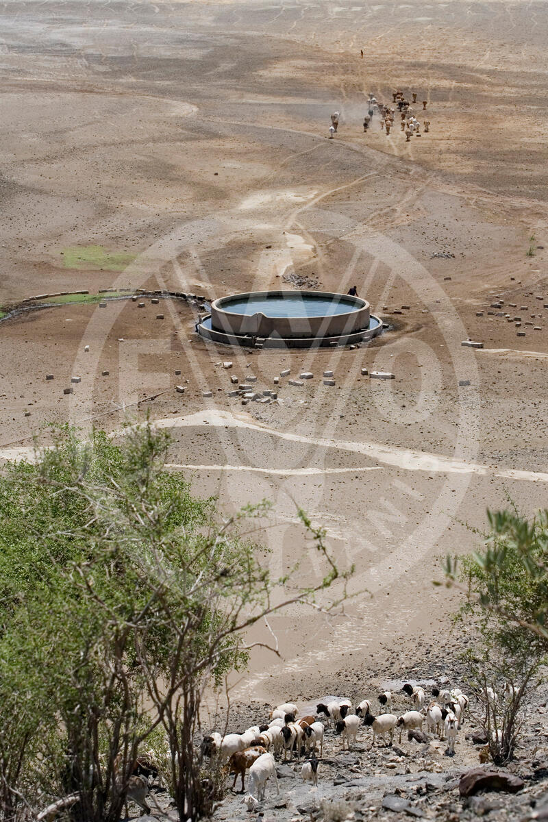 A woman collecting water amidst a herd of goats at a well at El Bes Oasis where pastoralists water their livestock also.