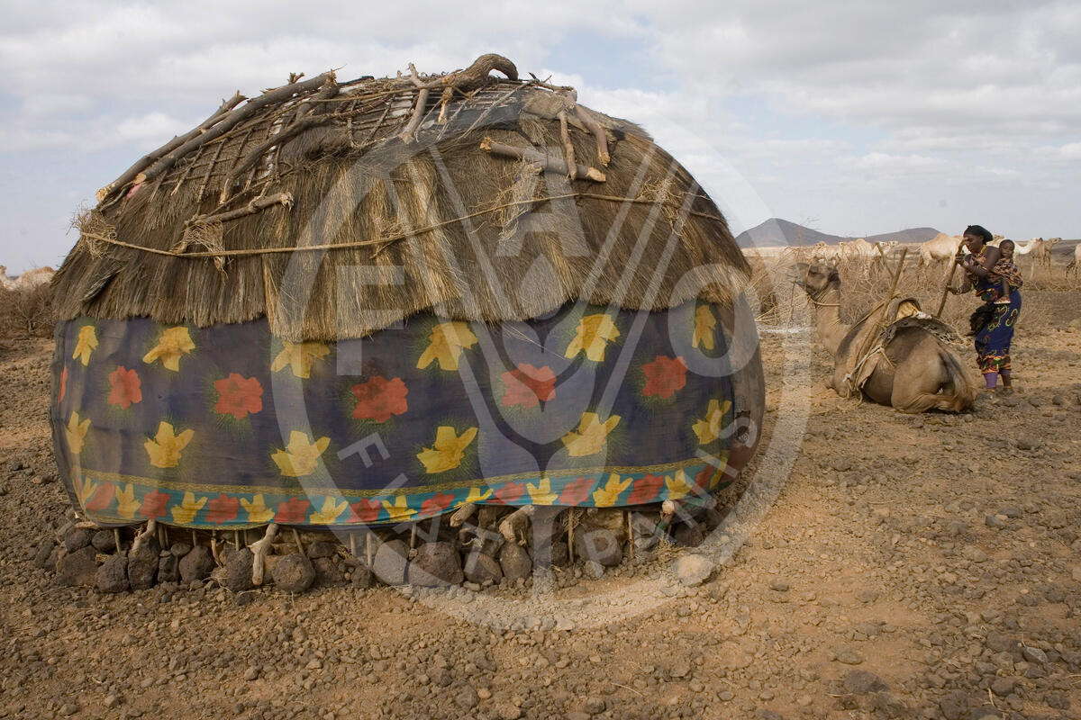 Members of a pastoralist settlement preparing a camel for a trek to the local well to collect water.