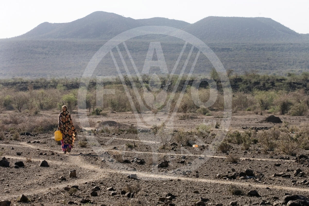 A woman carrying empty jerricans on the way to collect water at a watering hole.