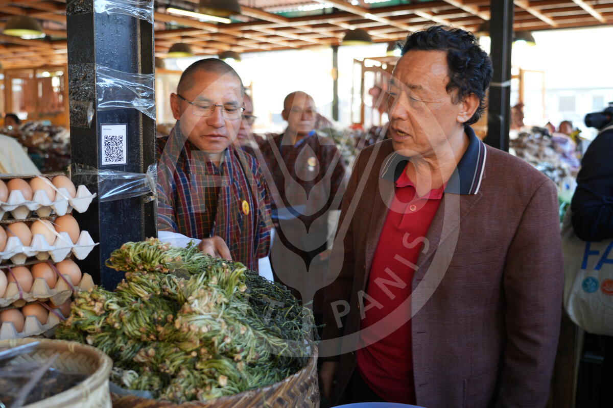 03 February 2025, Paro, Bhutan. FAO Director-General QU Dongyu (centre) visits a farmers market in Bondey.