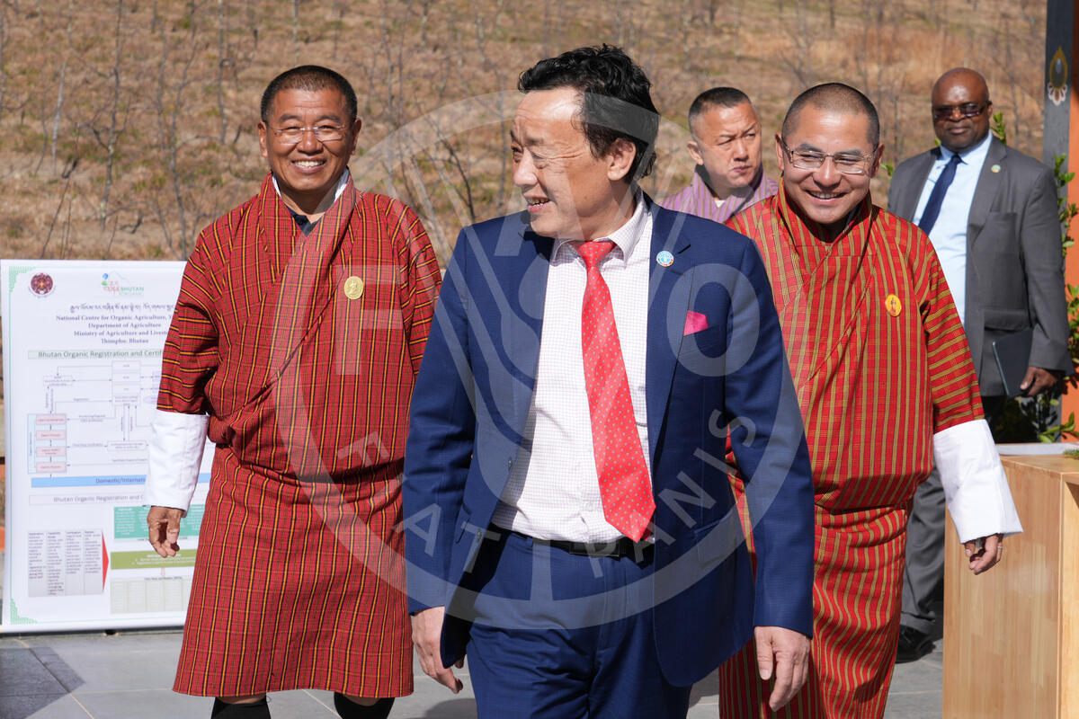 04 February 2025, Thimphu, Bhutan. FAO Director-General QU Dongyu, (centre), is escorted by the Minister for the Ministry of Agriculture and Livestock Younten Phuntsho (right), and the Director of Department of Agriculture Yonten Gyamtsho (left) during his visit at the National Centre for Organic Agriculture, Yusipang.