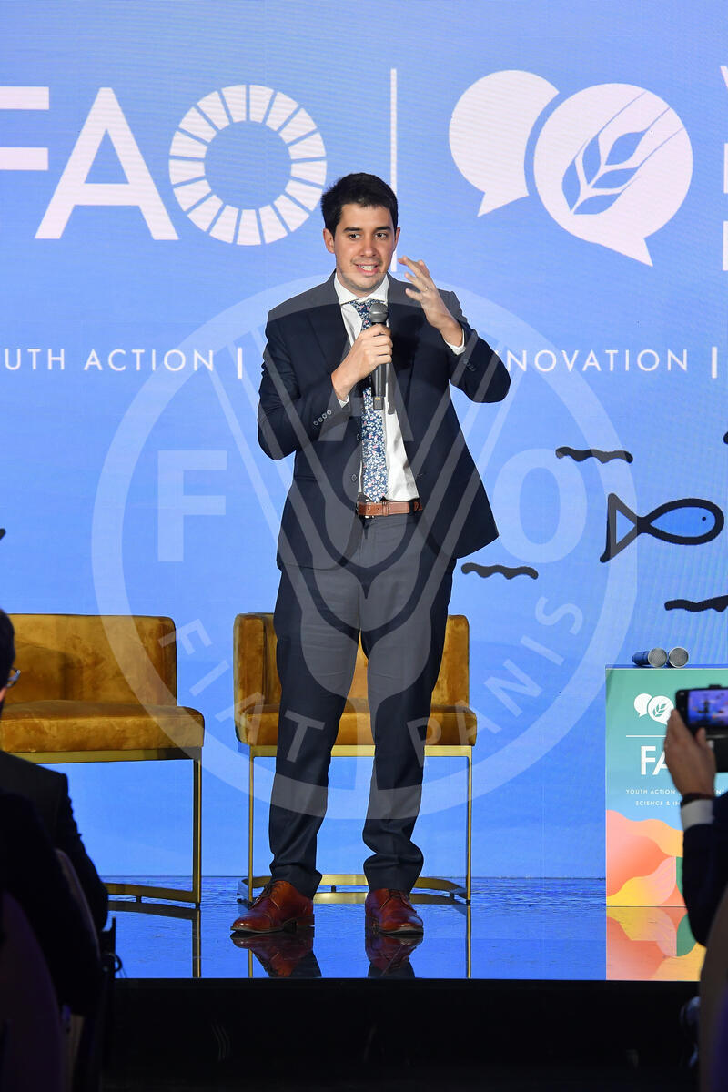 15 October 2024. Sheikh Zayed Centre (Atrium), FAO Headquarters, Rome, Italy. Assistant Secretary-General for Youth Affairs, Felipe Paullier present the closing remarks at the From Policy to Action: Youth shaping global agri-food systems event.