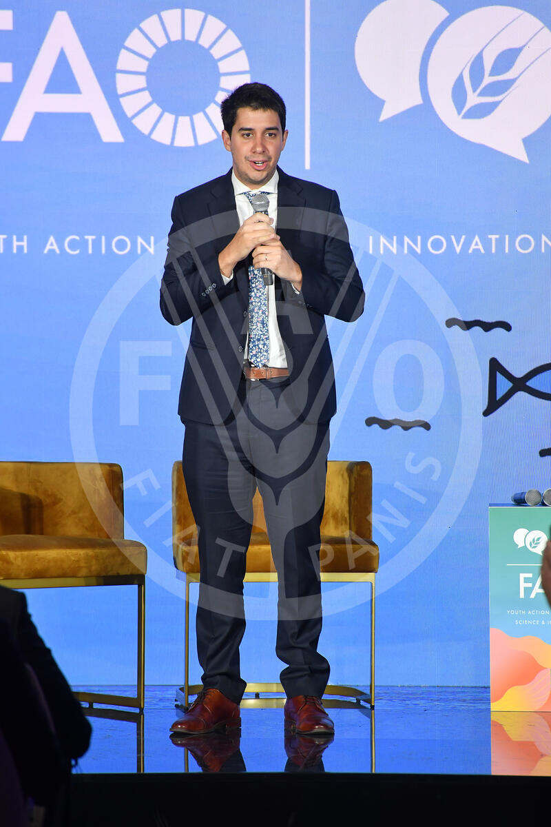 15 October 2024. Sheikh Zayed Centre (Atrium), FAO Headquarters, Rome, Italy. Assistant Secretary-General for Youth Affairs, Felipe Paullier makes his speeach.