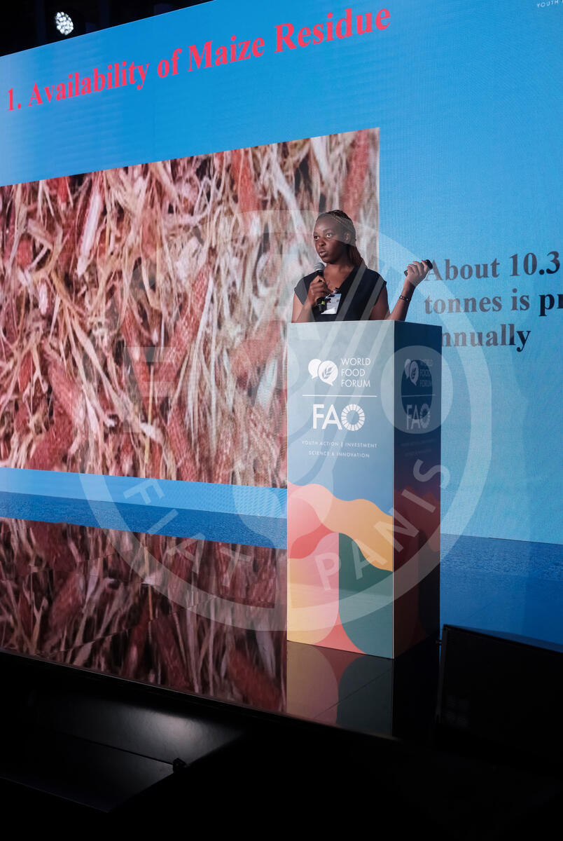 15 October 2024. Sheikh Zayed Centre (Atrium), FAO Headquarters, Rome, Italy. The second participant of the contest is Cadey Karibu Sana, who presents “The Utilization of Maize Crop Residue in the Production of Organic Manure in Kenya”.