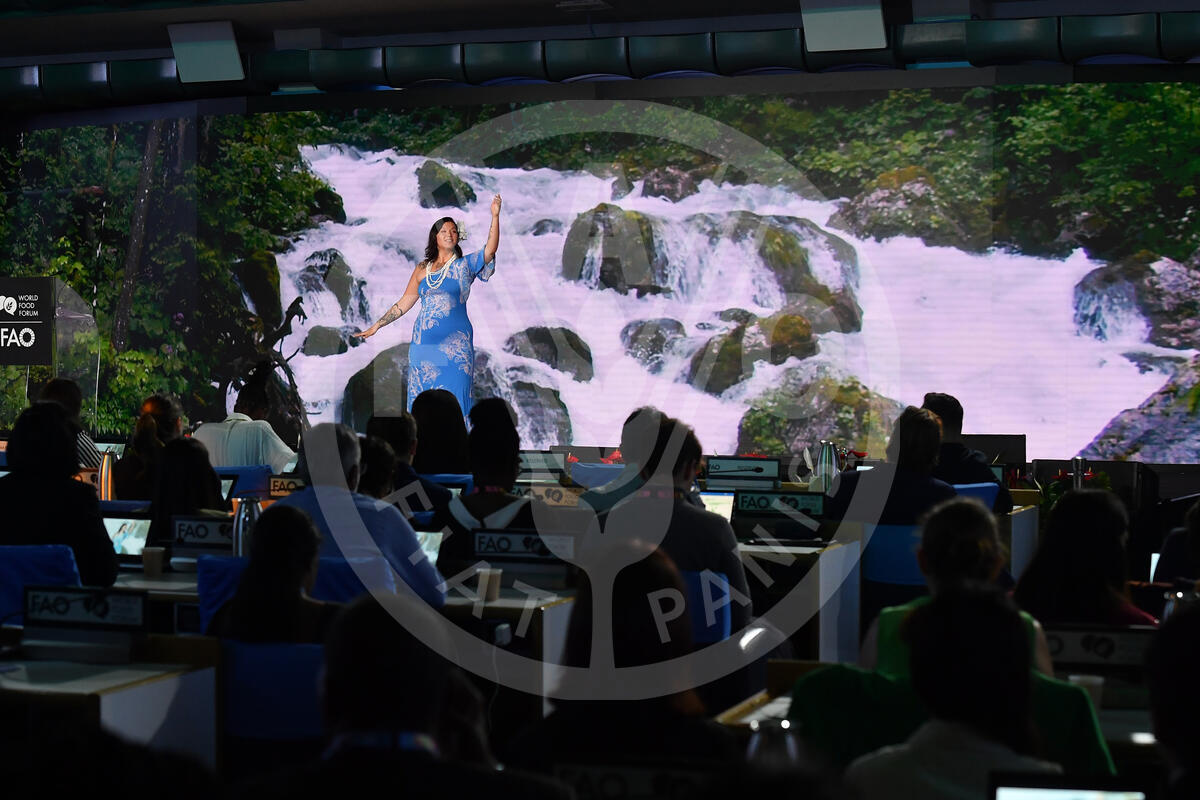 14 October 2024. Plenary Hall, FAO Headquarters, Rome, Italy. Pumehana performs a traditional dance from Hawaii at the World Food Forum Youth Assembly Opening Ceremony.