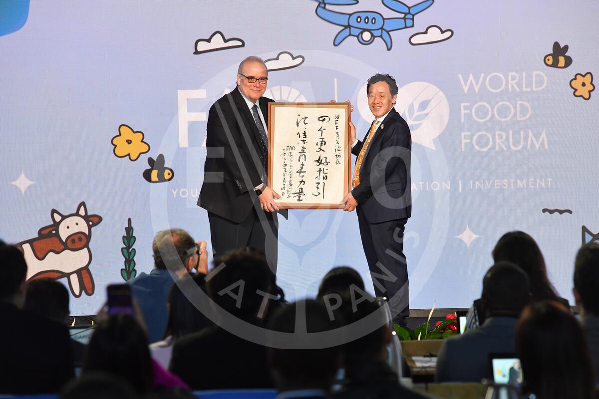 14 October 2024. Rome, Italy. FAO Director-General QU Dongyu gives his calligraphy as a gift to Máximo Torero, FAO Chief Economist and Youth Committee Chair at the World Food Forum Youth Assembly Opening Ceremony.