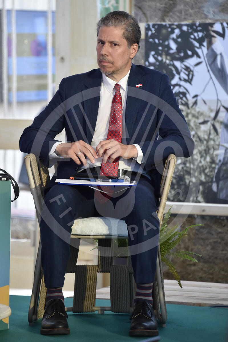 17 October 2024. Farm Venue, FAO Headquarters, Rome, Italy. H.E. Mario Arvelo Caamaño, Permanent Representative of the Dominican Republic to FAO, Chair of the UNDFF International Steering Committee, moderates the Global Family Farming Forum Closing.
