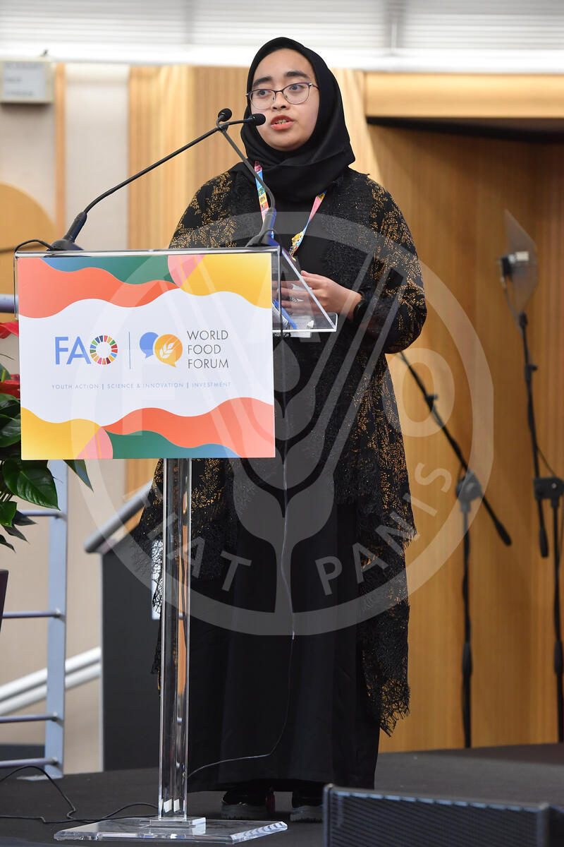 17 October 2024. Red Room, FAO Headquarters, Rome, Italy. Isnawati Hidayah, World Food Forum Young Scientists Group, gives her speech at the Joint SIF & Youth Forum: EmPOWERing Youth through innovative sustainable mechanization and digitalization.
