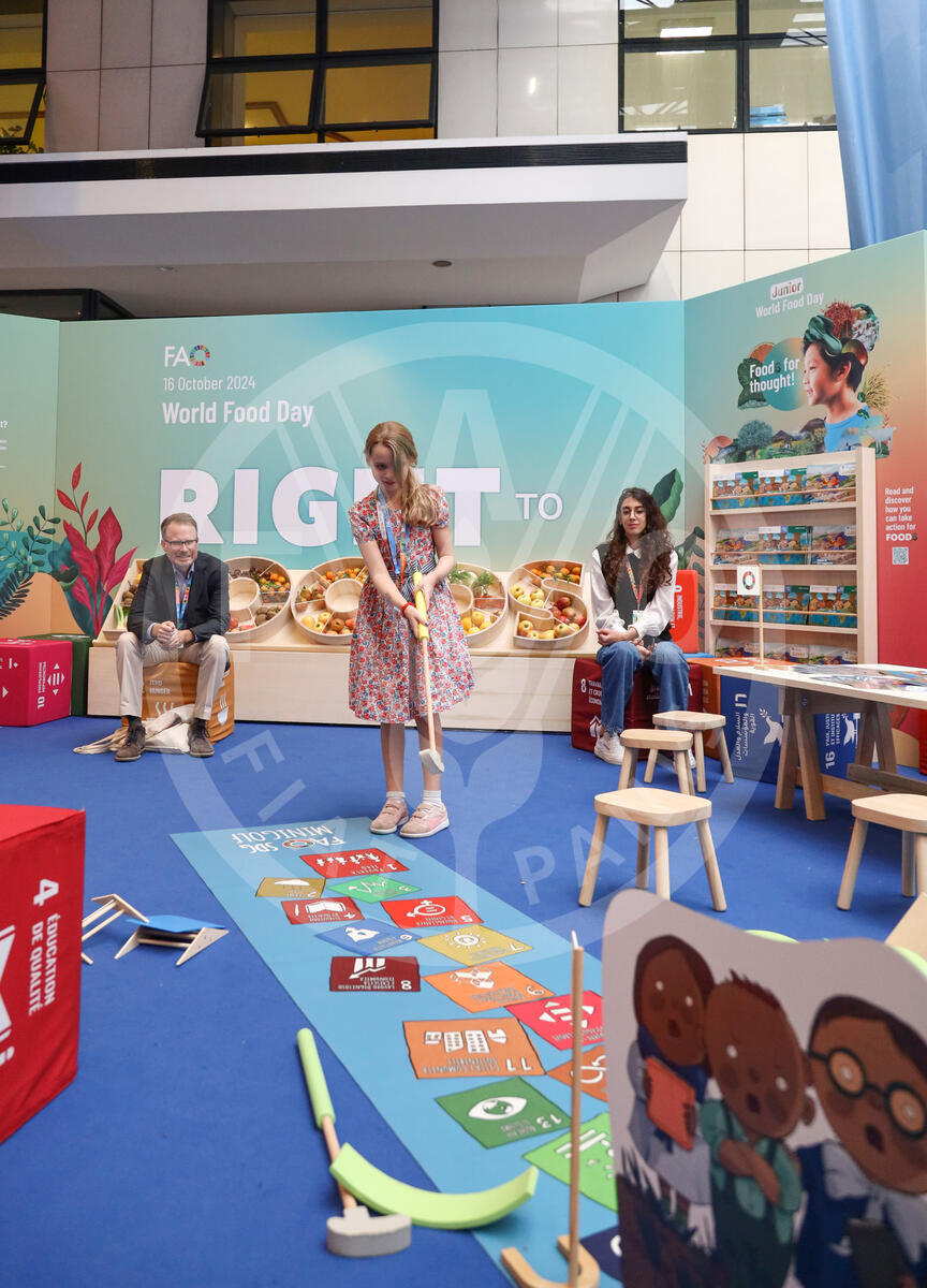 17 October 2024. Junior World Food Day Corner, Atrium, FAO Headquarters, Rome, Italy. World Food Forum attendees enjoying the Atrium exhibitions.