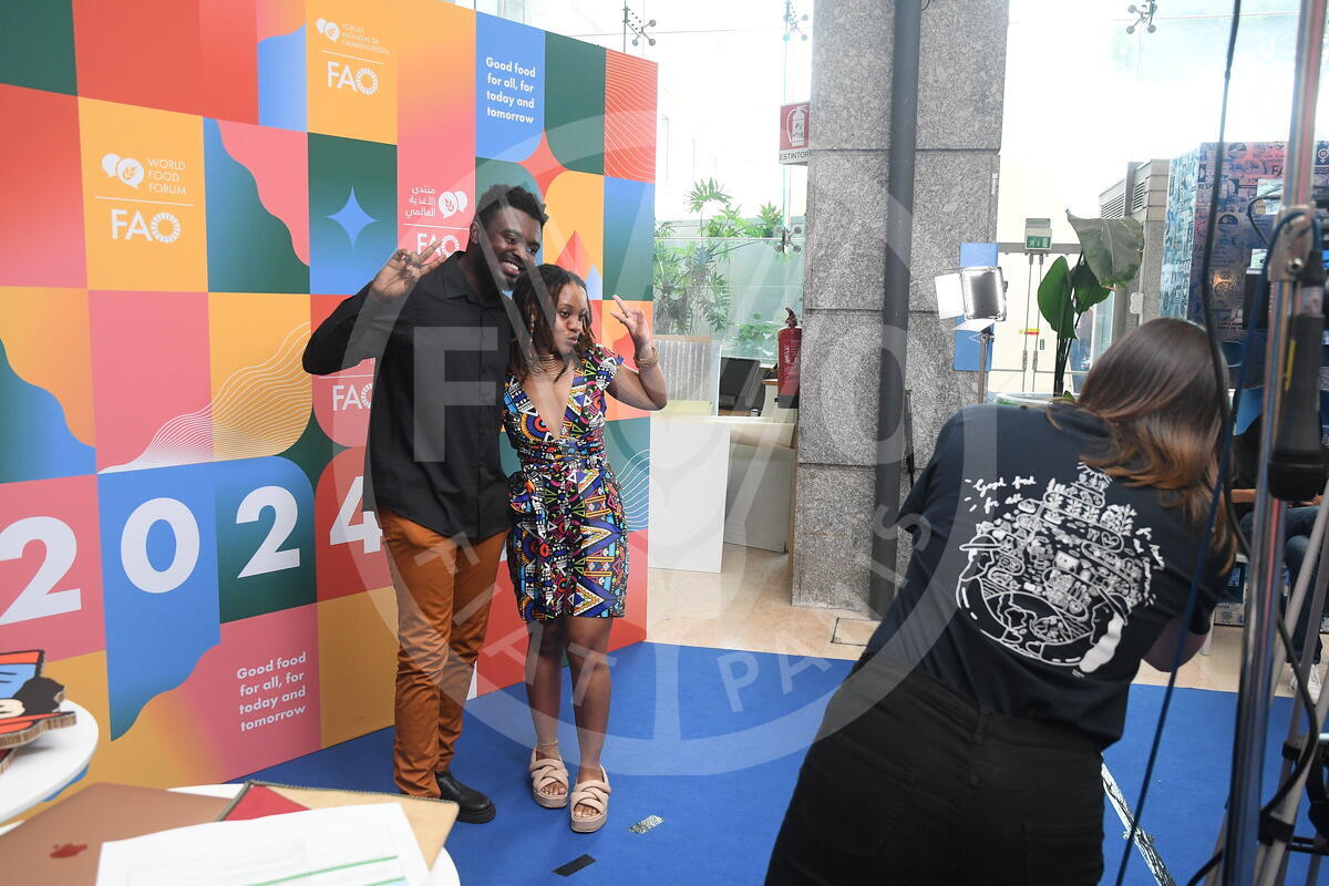 17 October 2024. Media Corner, Atrium, FAO Headquarters, Rome, Italy. World Food Forum attendees enjoying the atrium exhibitions.