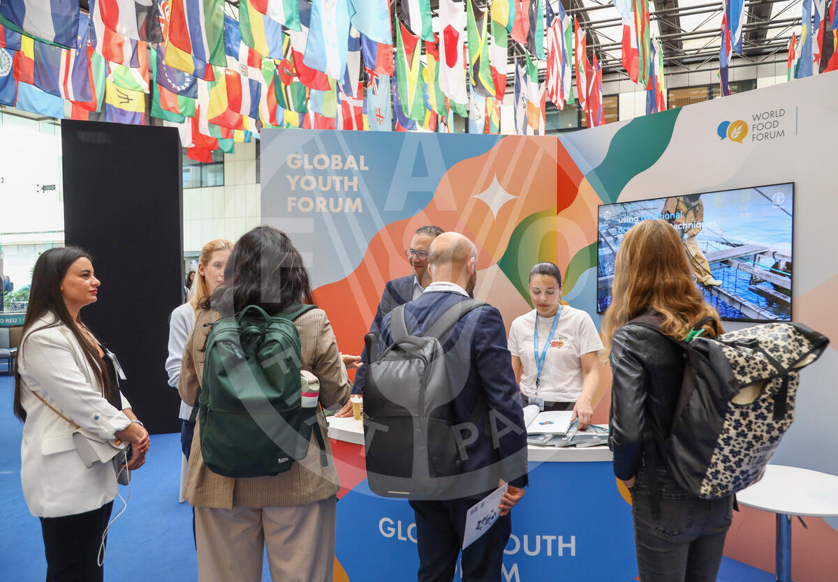 17 October 2024. Global Youth Forum, Atrium, FAO Headquarters, Rome, Italy. World Food Forum attendees enjoying the atrium exhibitions.