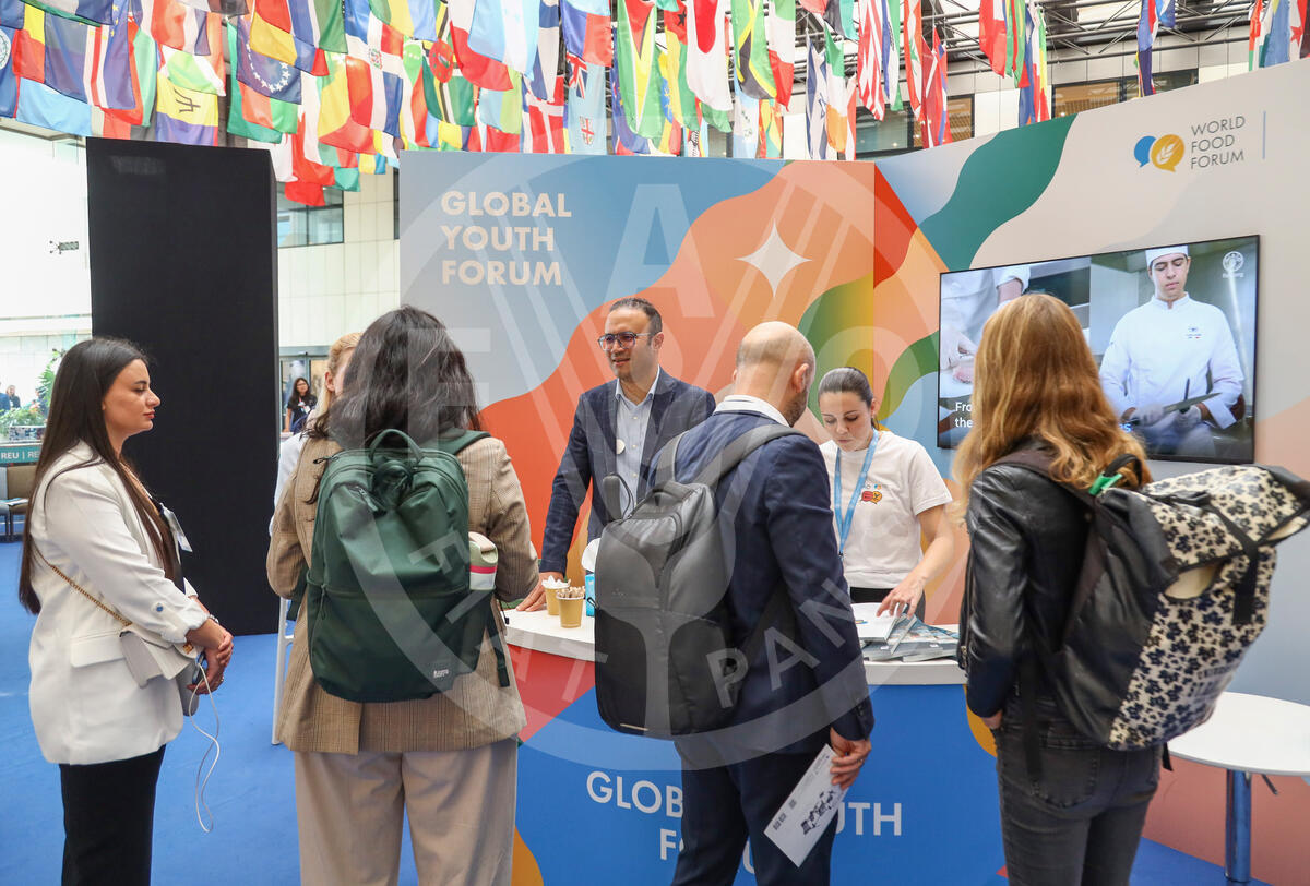 17 October 2024. Global Youth Forum, Atrium, FAO Headquarters, Rome, Italy. World Food Forum attendees enjoying the atrium exhibitions.