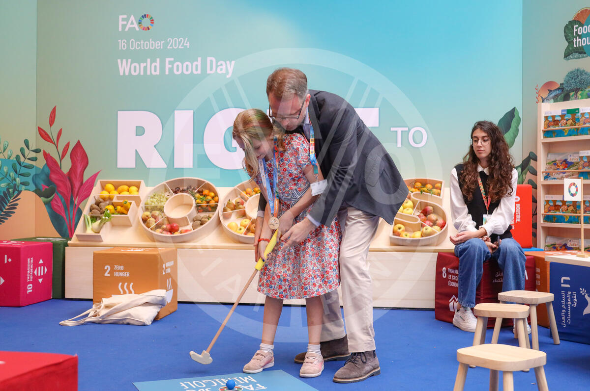 17 October 2024. Junior World Food Day Corner, Atrium, FAO Headquarters, Rome, Italy. World Food Forum attendees enjoying the Atrium exhibitions.