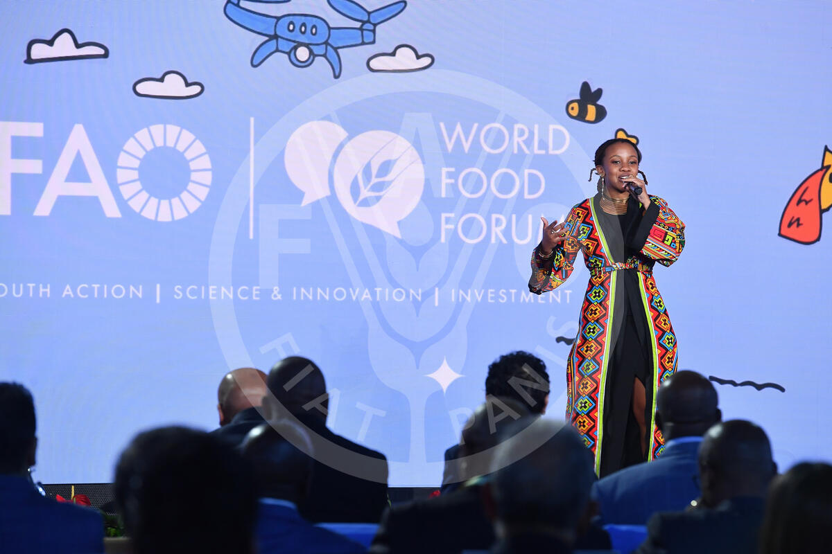 14 October 2024. Plenary Hall, FAO Headquarters, Rome, Italy. Mpiwa Gwindi, Zimbabwean singer, performs the WFF Anthem 2023 at the World Food Forum Grand Opening.