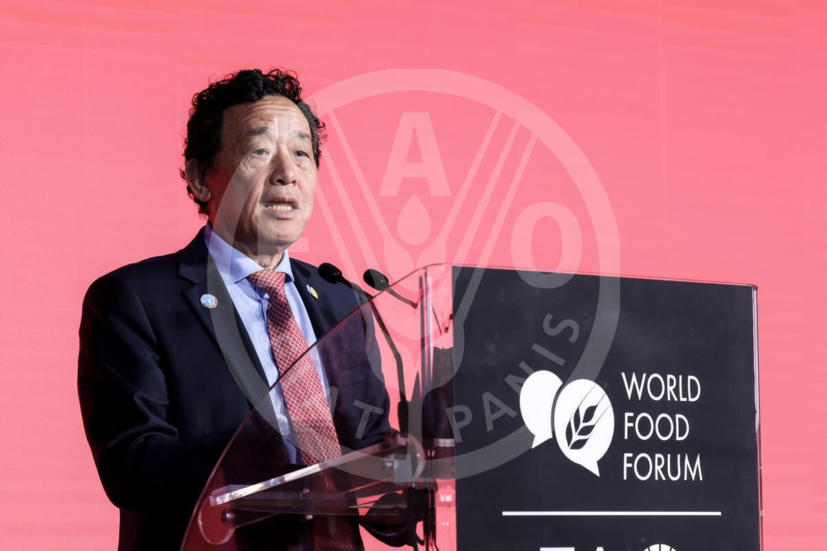 15 October 2024, Rome, Italy. FAO Director-General QU Dongyu speaks during the WFF HiH Investment Forum Celebration of 60th Anniversary of the Investment Centre. The fourth edition of the World Food Forum (WFF), the largest annual gathering of agrifood systems stakeholders globally, runs at FAO headquarters in Rome from 14 to 18 October 2024. FAO headquarters, (Plenary Hall).