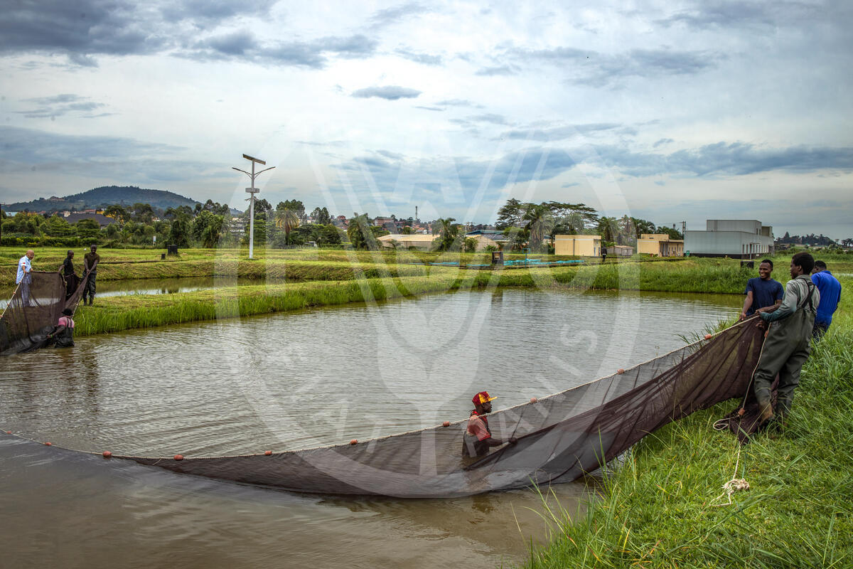 28 October 2024, Kajjansi, Uganda. Aquaculture Research & Development Centre (ADRC) workers pull the fishing net from the farm breeding ponds.
