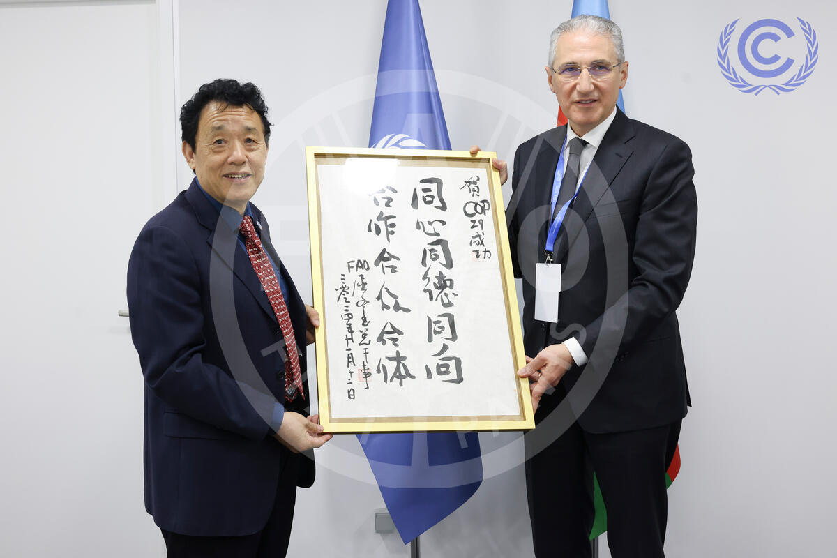 12 November 2024, Baku, Azerbaijan. FAO Director-General QU Dongyu (C) meeting with Mukhtar Babayev, President of COP29 (R) during COP29. The 29th UN Climate Change Conference (COP29) runs from November 11 to November 22 2024.