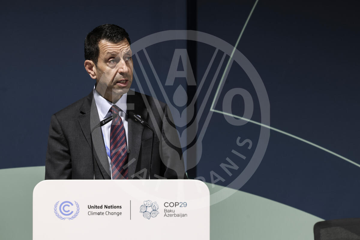 12 November 2024, Baku, Azerbaijan. FAO OCB Director Kaveh Zahedi speaks during the UN official high-level side event: Making climate finance work for climate action in agriculture and food security during COP29. The 29th UN Climate Change Conference (COP29) runs from November 11 to November 22 2024.