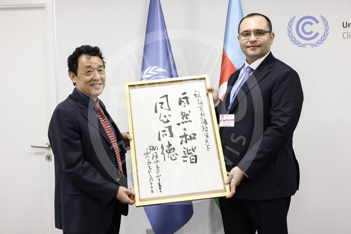 12 November 2024, Baku, Azerbaijan. FAO Director-General QU Dongyu (L) meeting with Majnun Mammadov, Minister of Agriculture of Azerbaijan (R) during COP29. The 29th UN Climate Change Conference (COP29) runs from November 11 to November 22 2024.