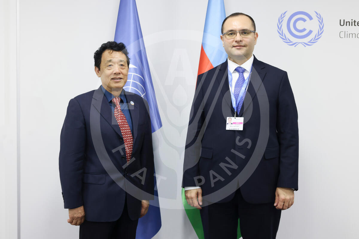 12 November 2024, Baku, Azerbaijan. FAO Director-General QU Dongyu (C) meeting with, Majnun Mammadov, Minister of Agriculture of Azerbaijan (R) during COP29. The 29th UN Climate Change Conference (COP29) runs from November 11 to November 22 2024.