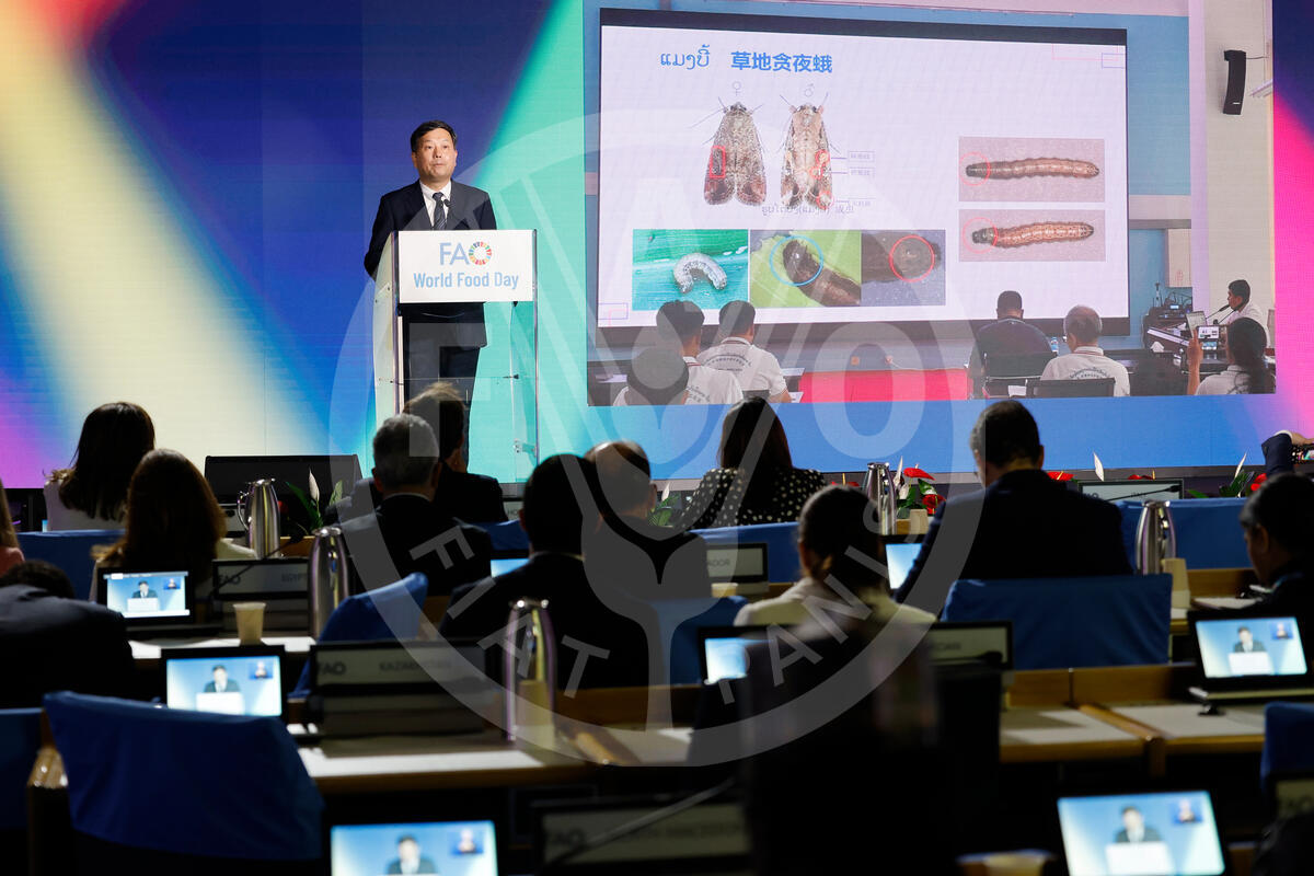 16 October 2024. Rome. Italy. Professor Lu Yanhui, Director-General Institute of Plant Protection Chinese Academy of Agricultural Sciences (IPPCAAS), speaks during the FAO Awards for Achievement ceremony, FAO headquarters (Plenary Hall).