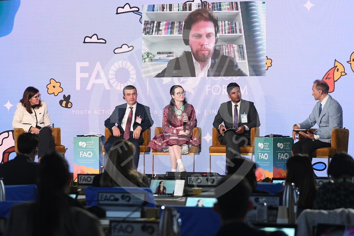 16 October 2024. Plenary Hall, FAO Headquarters, Rome, Italy. Sara-Elvira Kuhmunen, President of the Sámi Youth Association, gives her speech at the plenary session "Closing the Science, Technology, and Innovation Gap."
