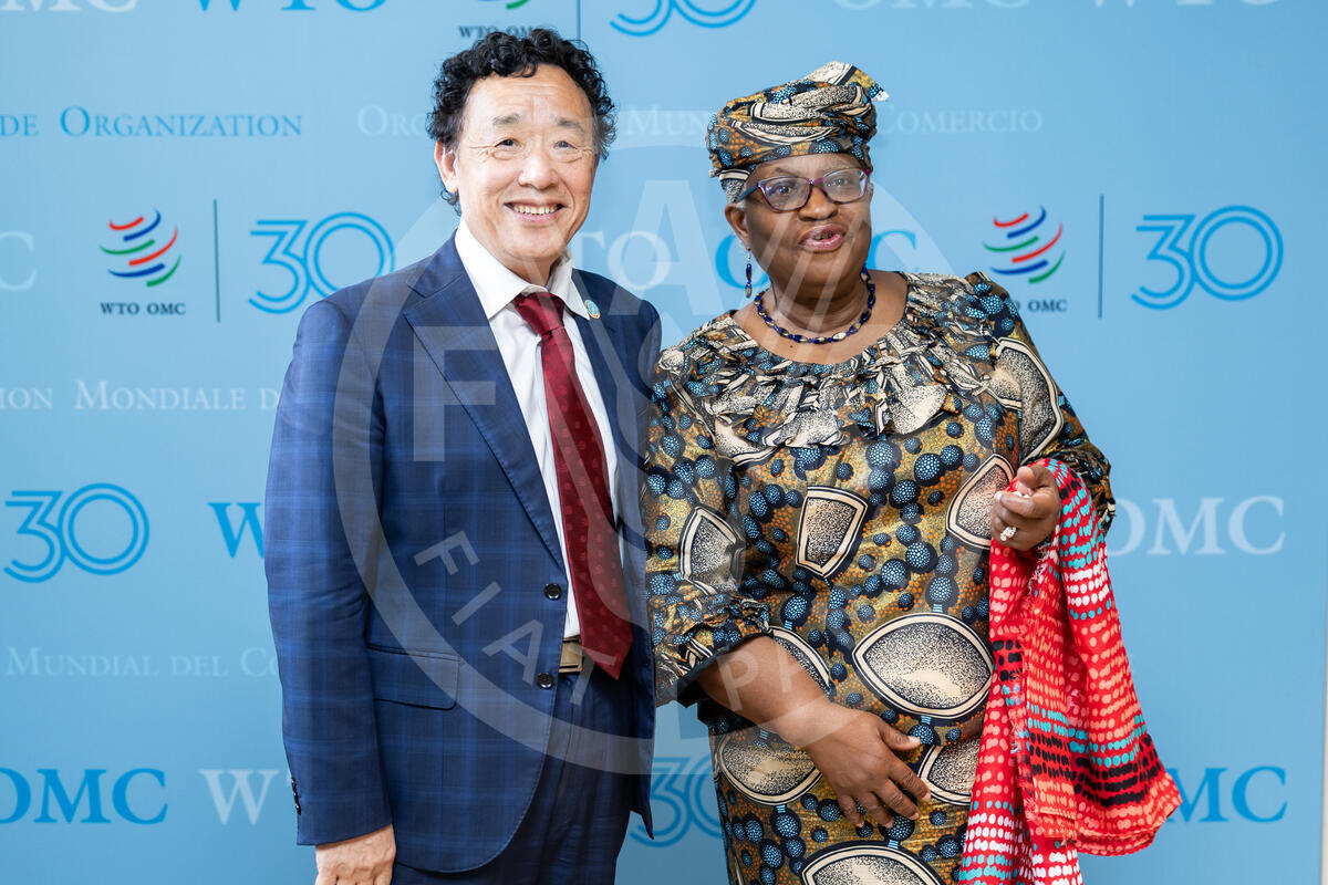 27 June 2024, Geneva, Switzerland - FAO Director-General QU Dongyu and WTO Director Ngozi Okonjo-Iweala exchange gifts during a bilateral meeting at the WTO Global Review of Aid for Trade 2024.