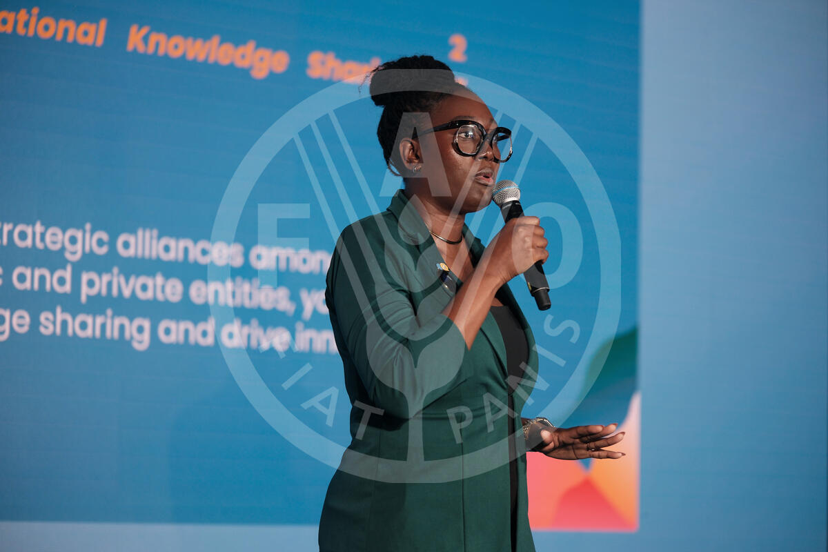 18 October 2024. Sheikh Zayed Centre, FAO Headquarters, Rome, Italy. Chemora McKnee, representing Latin America and the Caribbean, gives her speech at the World Food Forum Youth Assembly Global Action Plan Launch.
