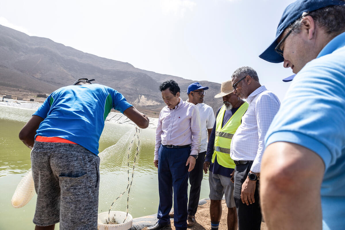 27 July 2024, Calhau, São Vicente, Cabo Verde - FAO Director-General QU Dongyu (C), accompanied by Minister of Agriculture and Environment of Cabo Verde, Gilberto Silva, (R) visiting Fazenda de Camarão Shrimp farm in Calhau. The visit provided valuable insights into the potential of aquaculture to contribute to food security and economic growth in Cabo Verde, aligning with FAO’s goals of promoting sustainable agriculture and fisheries.
